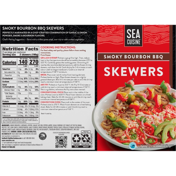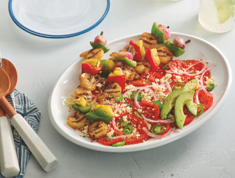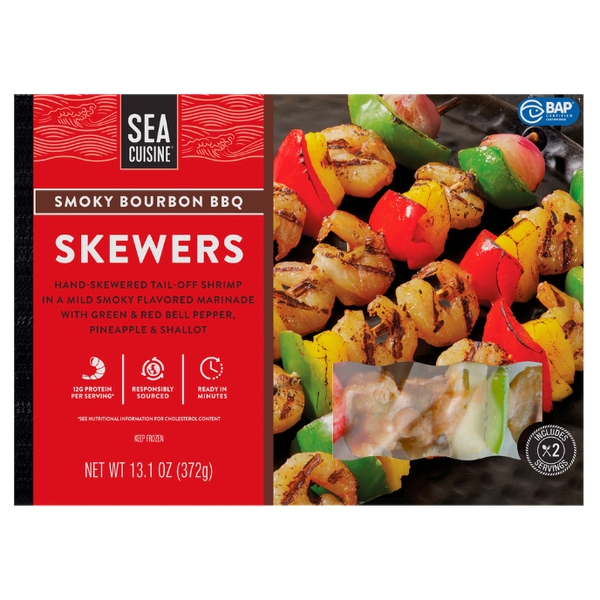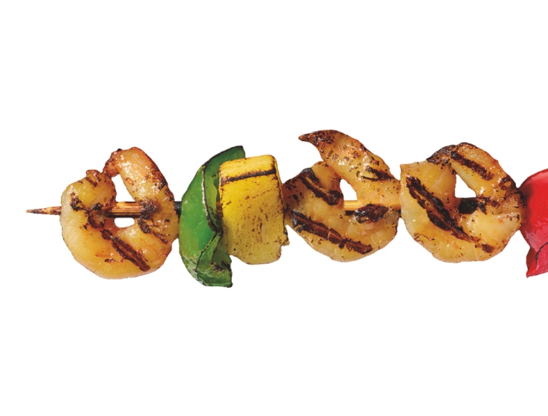 Perfectly marinated tail-off shrimp skewers in a mild smoky flavored marinade with green & red bell pepper, pineapple & shallot.