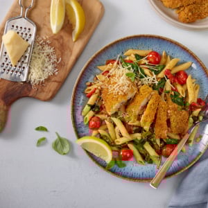 Pesto Pasta Bowl with Garlic Bread Crusted Tilapia