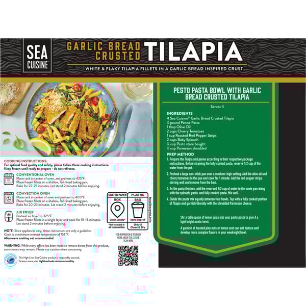 Make delicious seafood easily with Sea Cuisine® Garlic Bread Crusted Tilapia—five premium fillets with 15g protein each. Bake or air fry from frozen for a quick, flavorful meal in under 25 minutes.